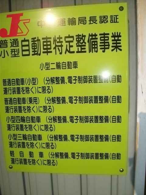 2級整備士・検査員資格を持っている私が、バッチリ整備します。 | この看板は、交通省から自動車整備のプロとして認められた店(設備・整備士等) に与えられる物です。 |
